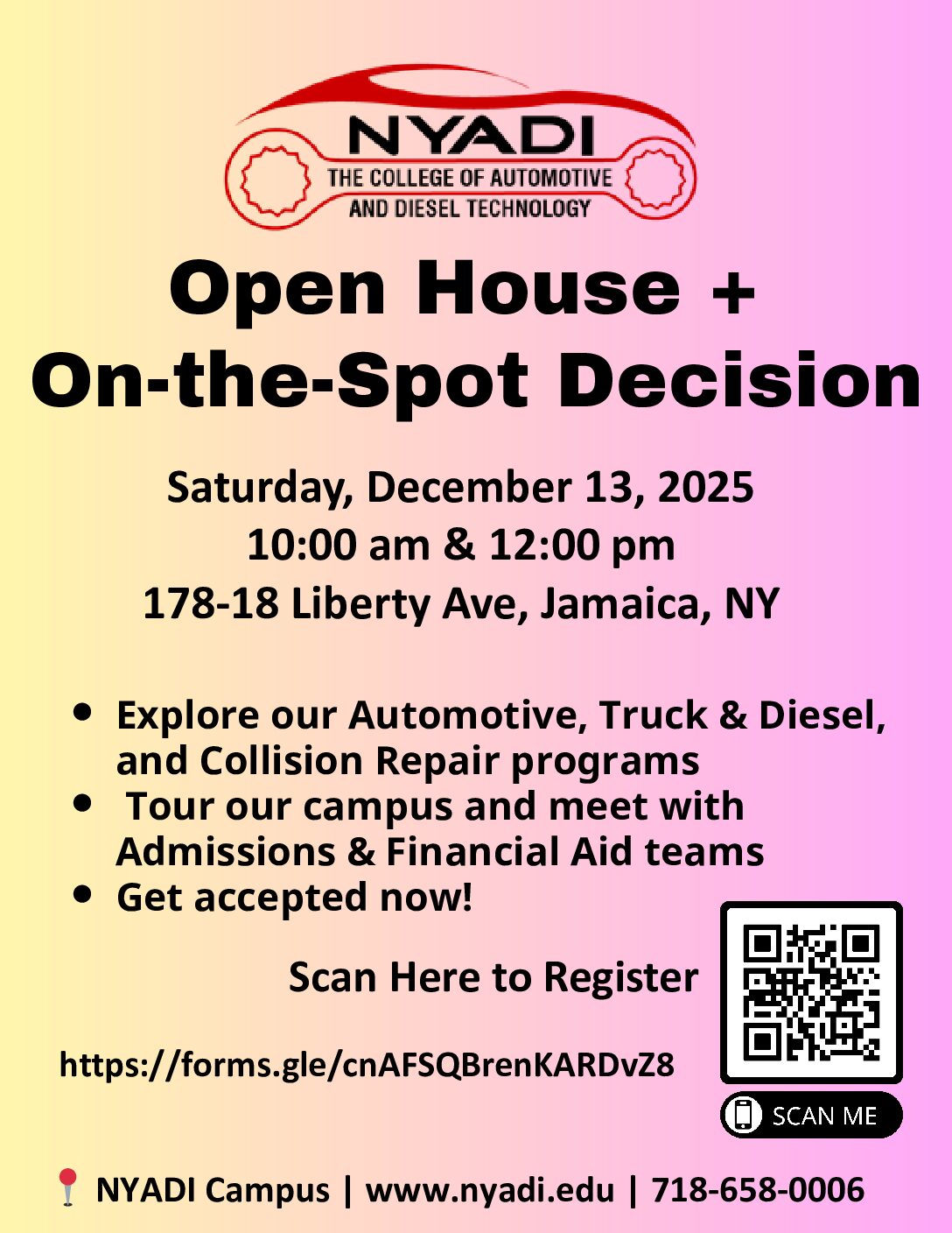 Unlock your future with New York Automotive & Diesel Institute! Our Associate Degree and Certificate programs prepare you for a career in the growing high-tech automotive industry. Whether you’re a veteran, recent high school graduate, or adult learner, we have the perfect program for you. NYADI has rolling admissions throughout the year. When can you start? Don’t wait—register today for technical school and drive your career forward with NYADI.